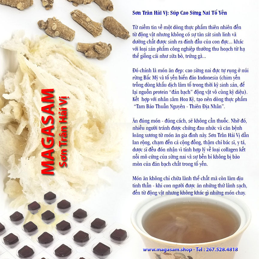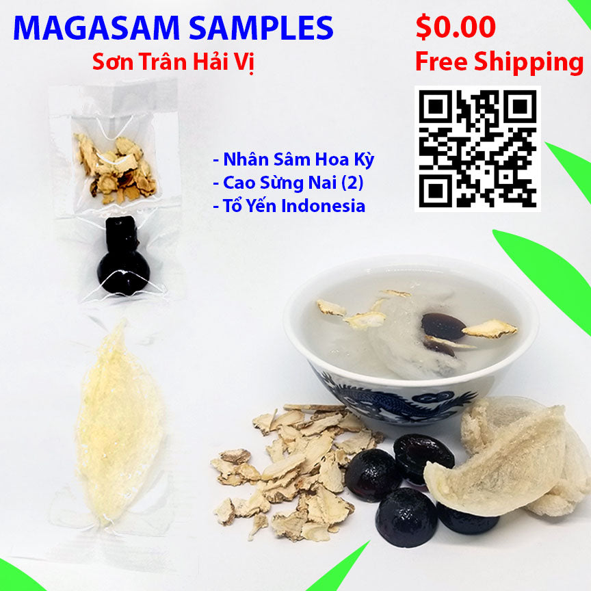 FREE SAMPLE PACK CHO MỖI KHÁCH HÀNG: Hãy trải nghiệm đỉnh cao của món Sơn Trân Hải Vị: Yến Sào, Lộc Giác Giao và Nhân Sâm Hoa Kỳ (Free Samples)Súp Cao Sừng Nai Tổ Yến: Từ niềm tin về một dòng thực phẩm thiên nhiên đến từ động vật nhưng không có sự tàn sát sinh linh và dưỡng chất được sinh ra đỉnh đầu của con đực... khác với loại sản phẩm công nghiệp thường thu hoạch từ hạ thể giống cái như sữa bò, trứng gà...